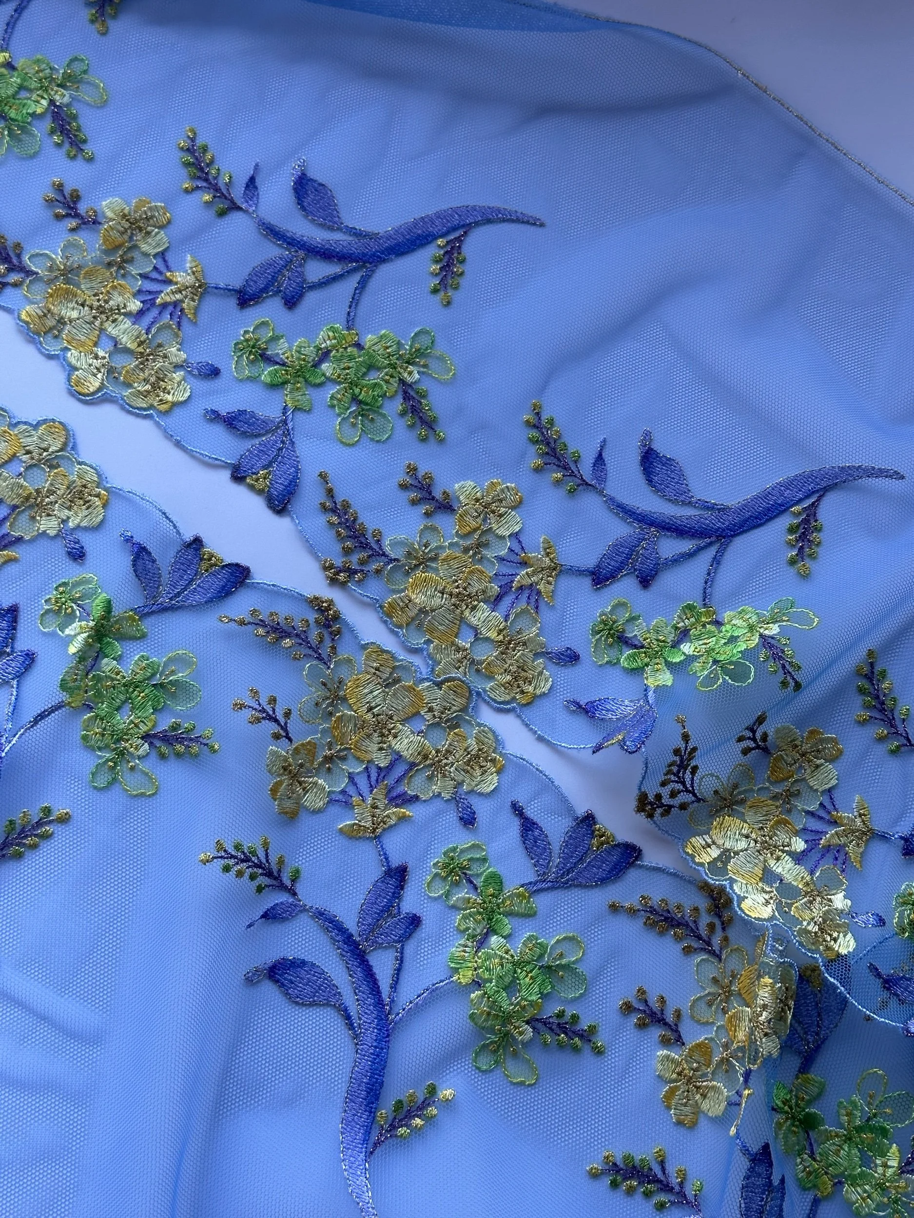 This is a high-quality lace with a soft hand feel tulle, adorned with beaitful yellow foral embroidery motifs. Yellow Gold Lurex details all along the flowers and bordering the stem. The colors on this lace have gradients of sky blue, periwinkles, topaz blue, dark purple, lime green and sun yellow.