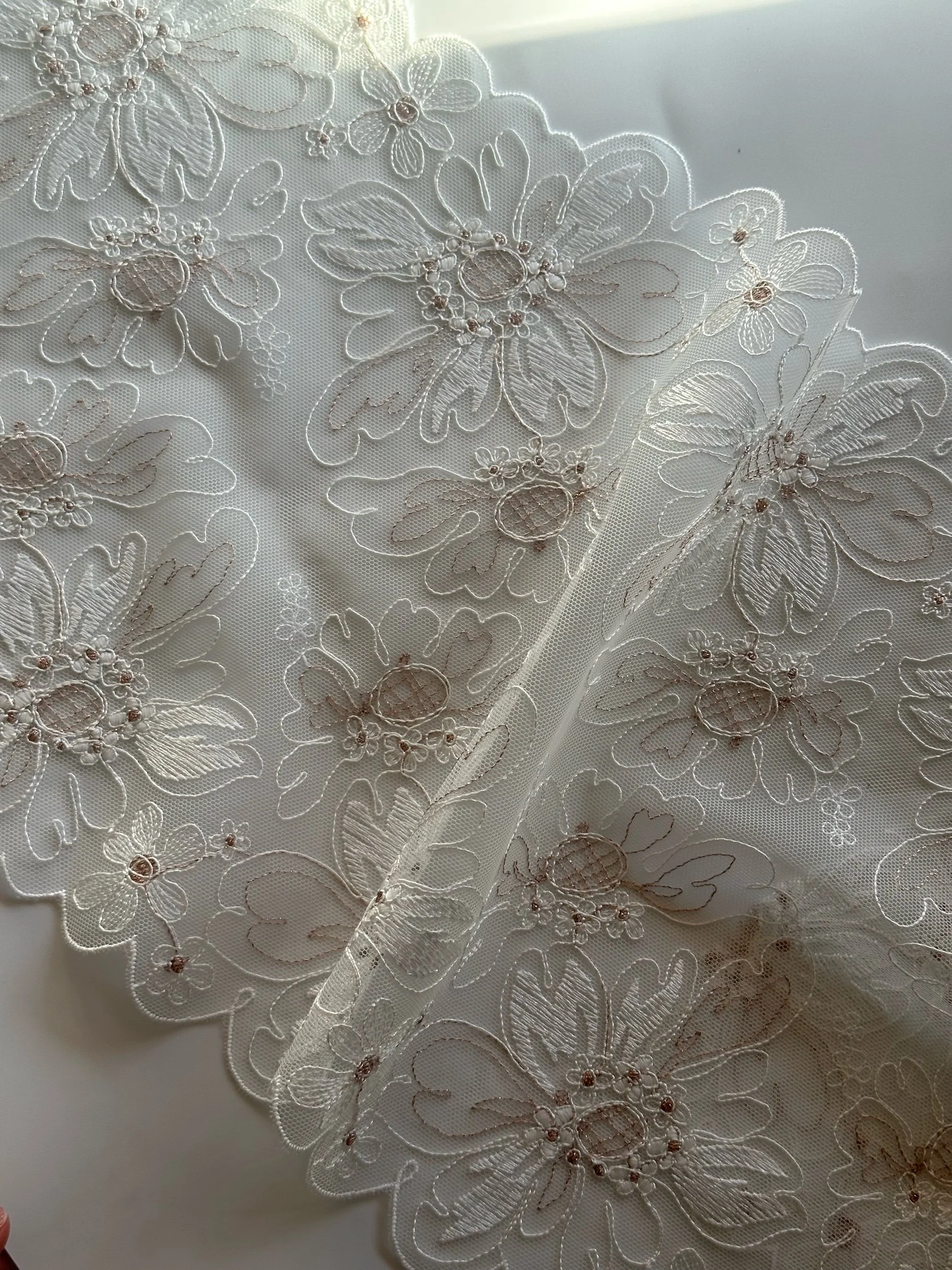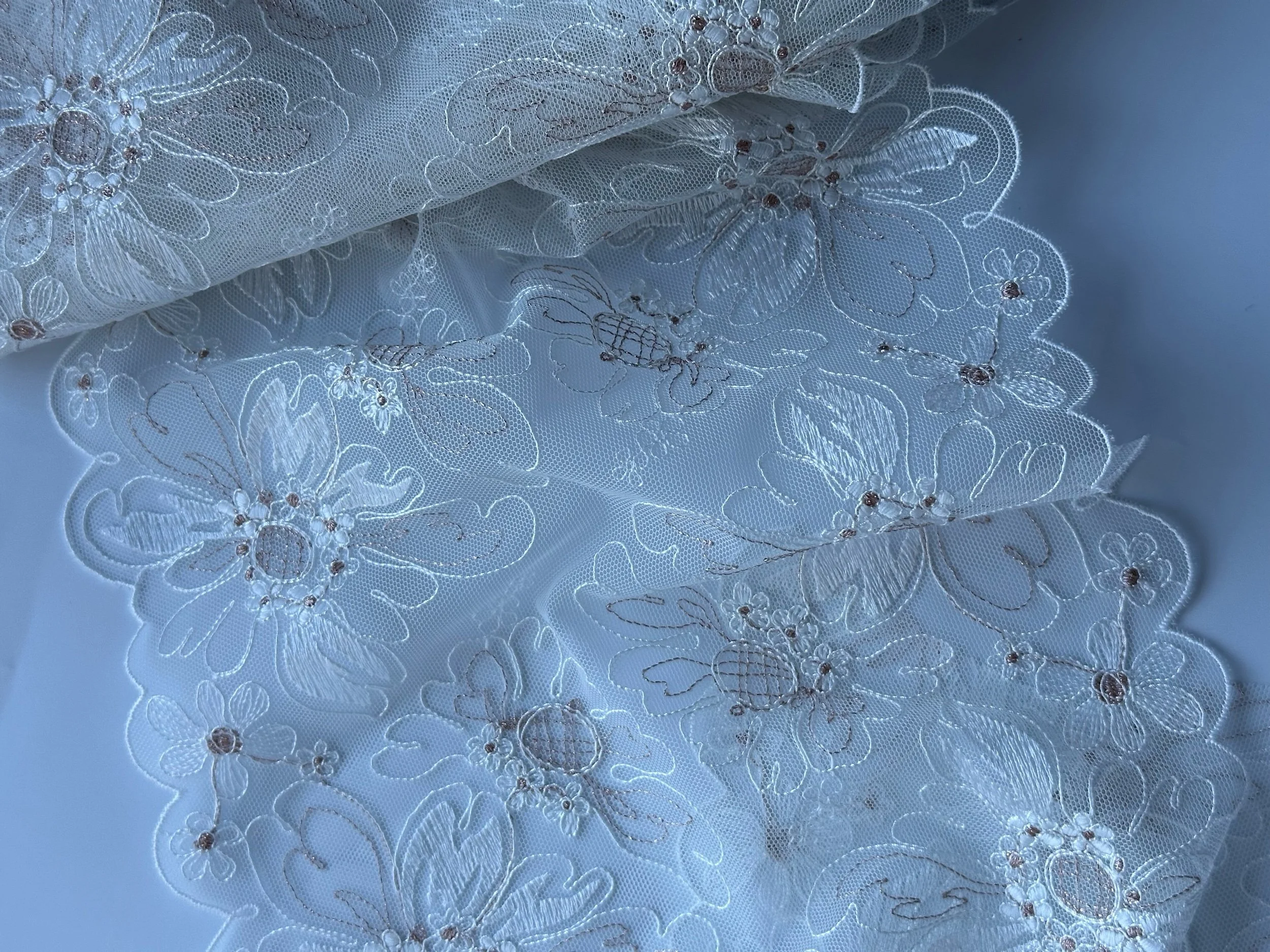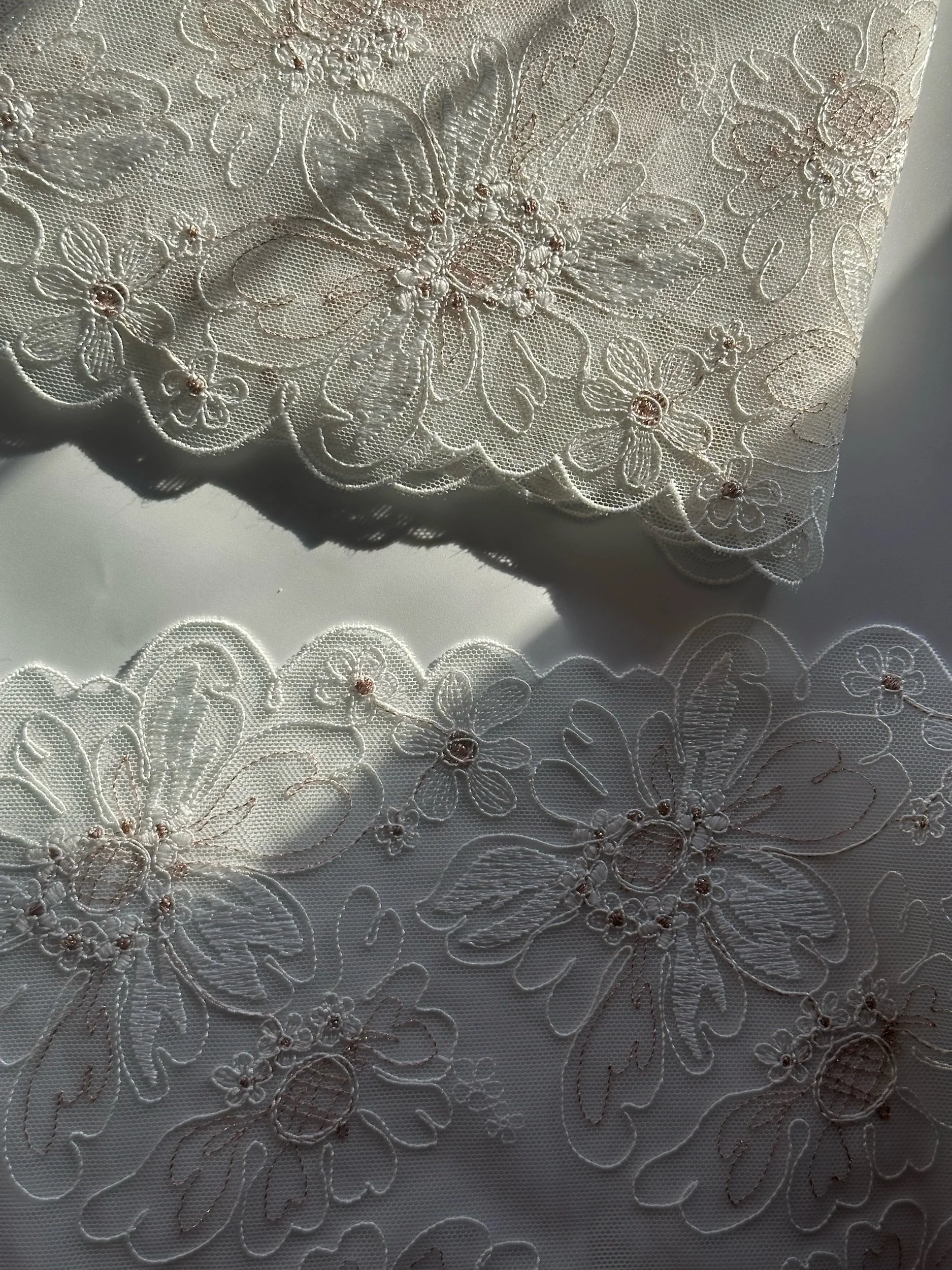 Very high quality lace that features so many wonderful details! Parts are finely corded, some matte threads, some shiny, and rosegold lurex details throughout. This lace is bilateral but does NOT have a mirrored side. Both the bottom and top of the embroidery are facing the same direction.