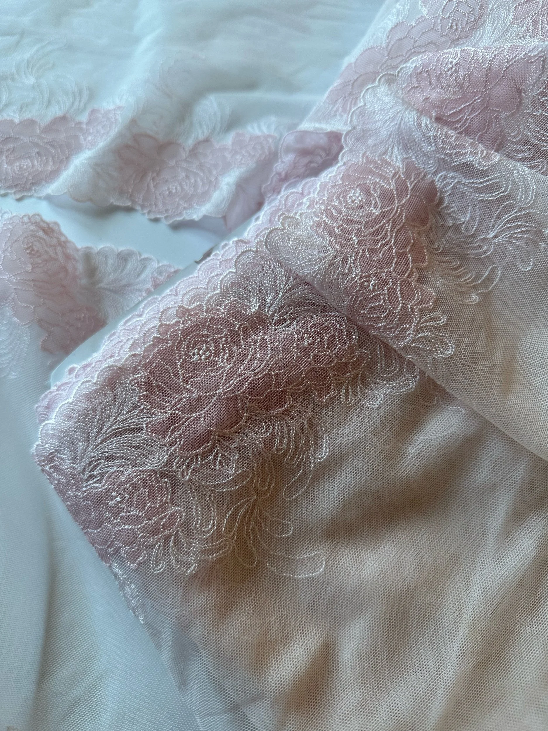 Soft hand feel, STUNNING embroidery. The roses feature sewn on appliqué tulle that’s slightly darker. The tulle is a slightly muted baby pink/peach color.
