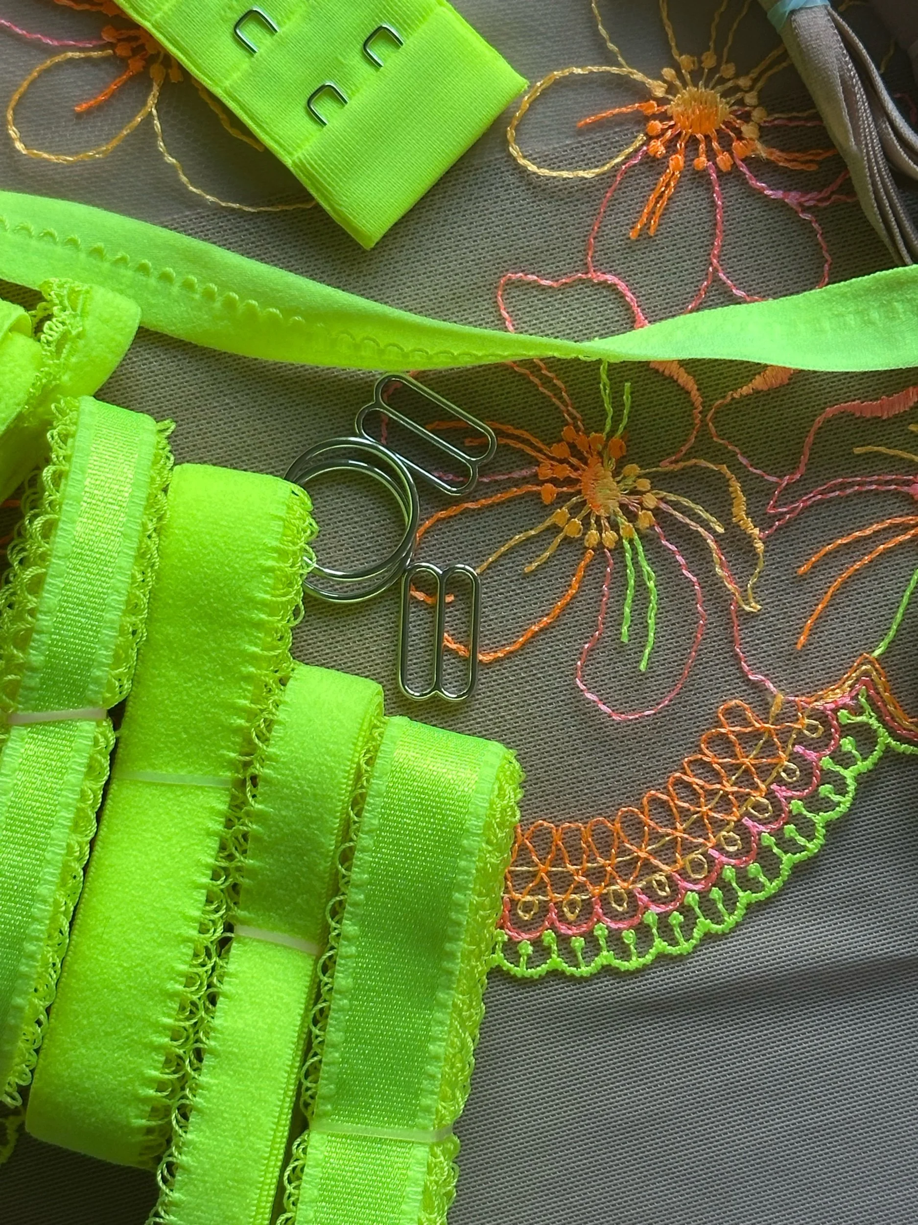This kit is the PERFECT “pick me up” set! You will feel so happy sewing it, and even happier wearing it! This striking lace features Honey Birdette Deadstock that has electric gradients of neon yellow, orange, and pink. The tulle has an extremely fine, soft hand feel, with mechanical stretch in all directions. The embroidery has a “shiny” satin appearance.