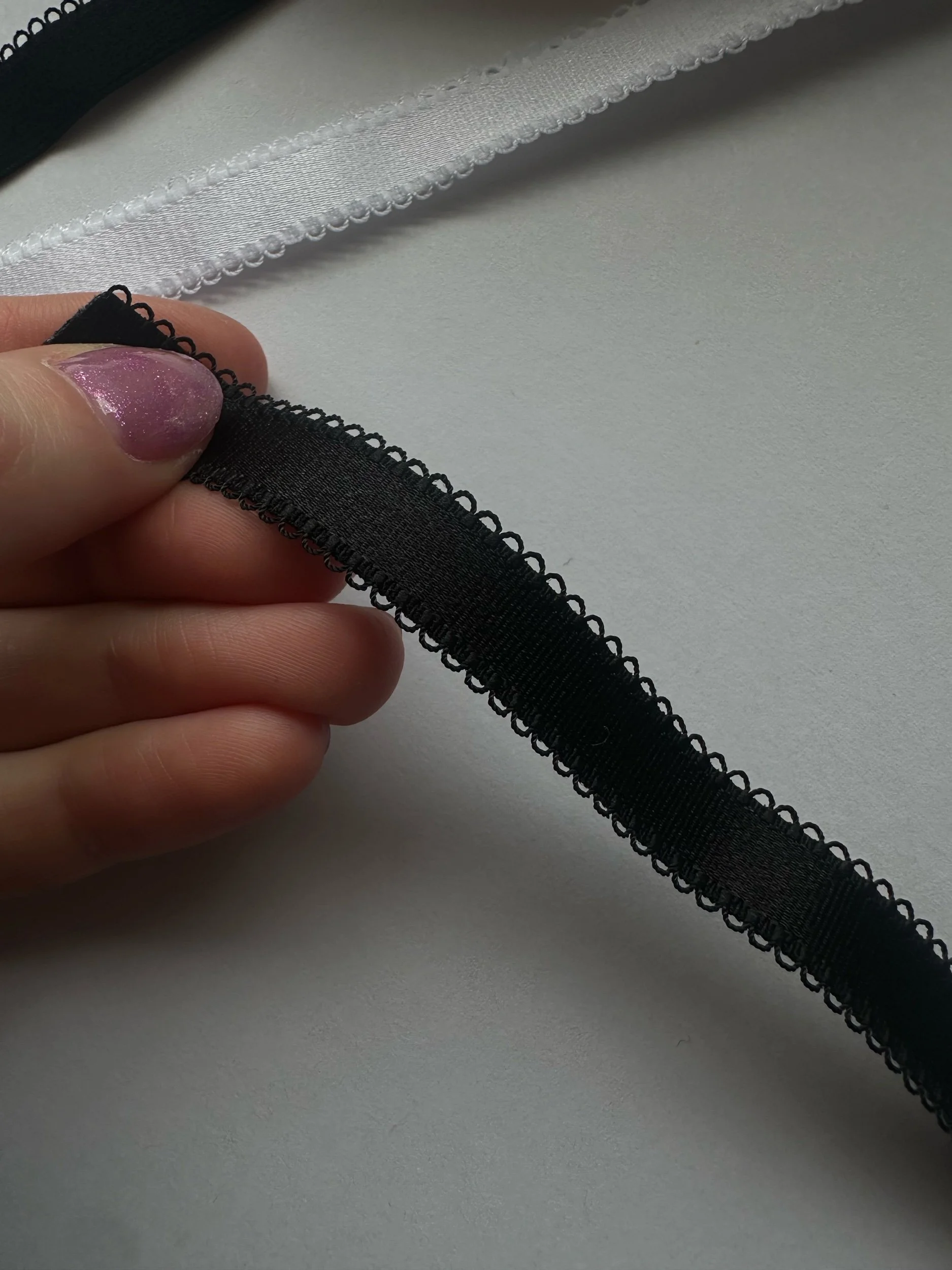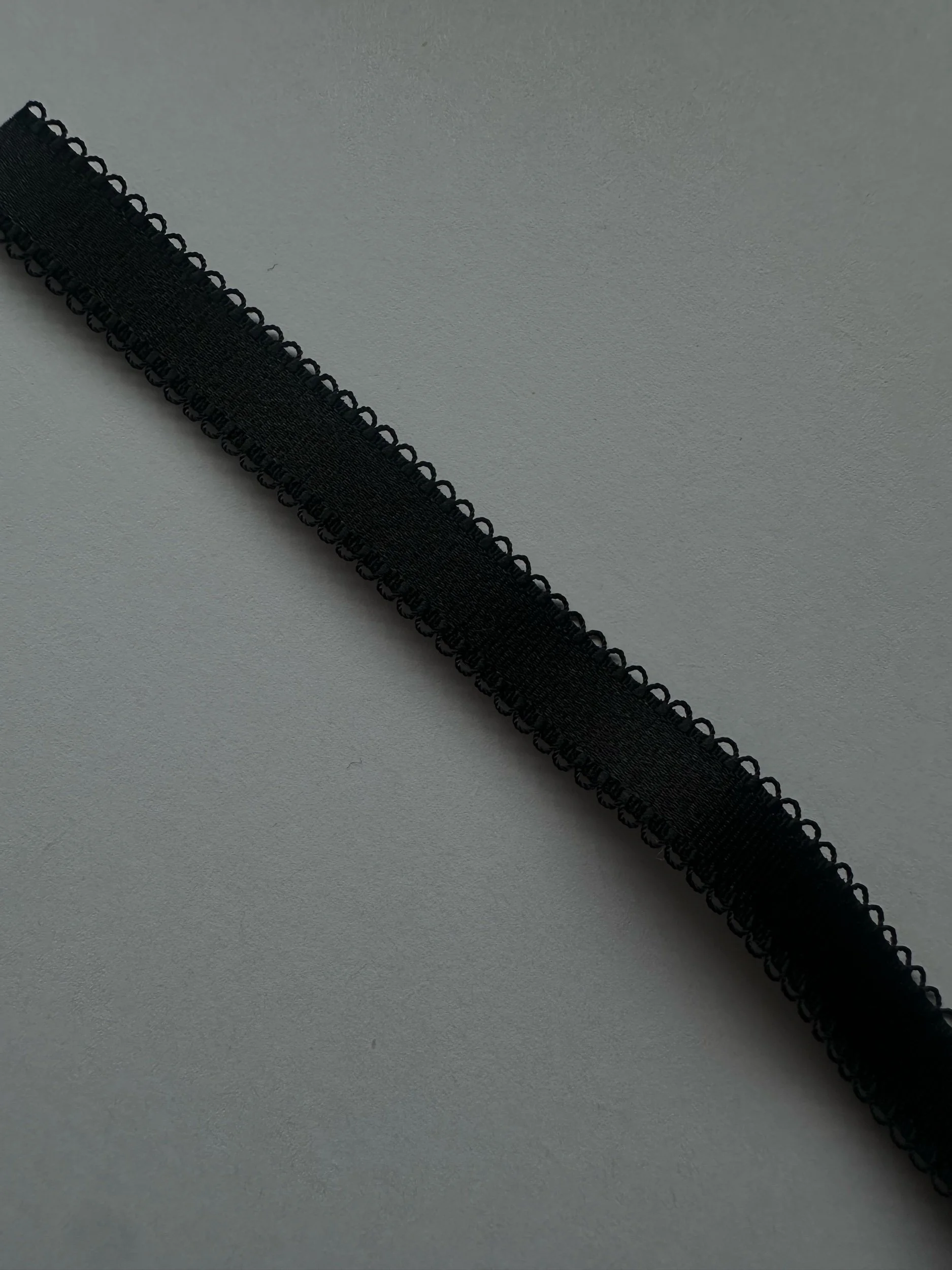Regular picot bra strap in 12mm. Nylon, spandex, has dainty braided picot on both edges.