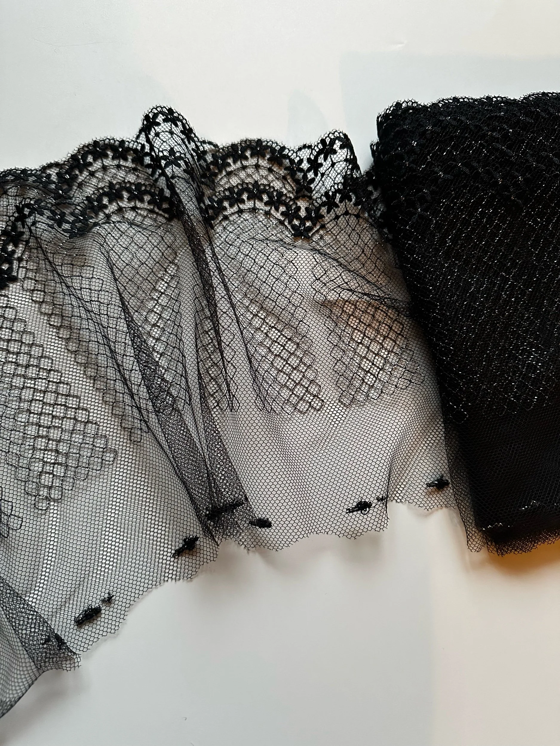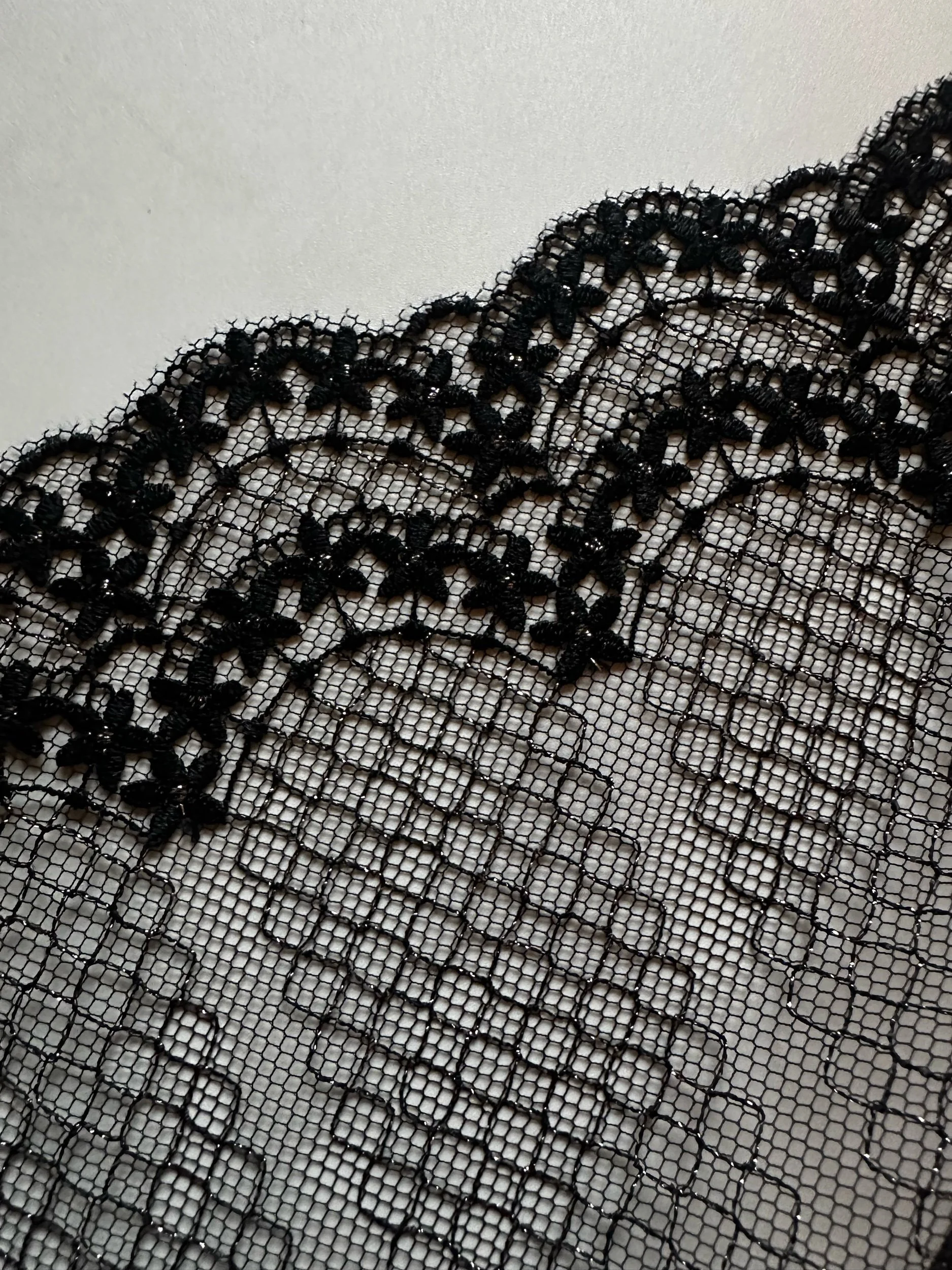 Exquisite black lace with Lurex silver threads in geometric design, resembling a chain link fence ⛓️⛓️ Tulle feels soft to the touch, hexagonal holes are larger.
