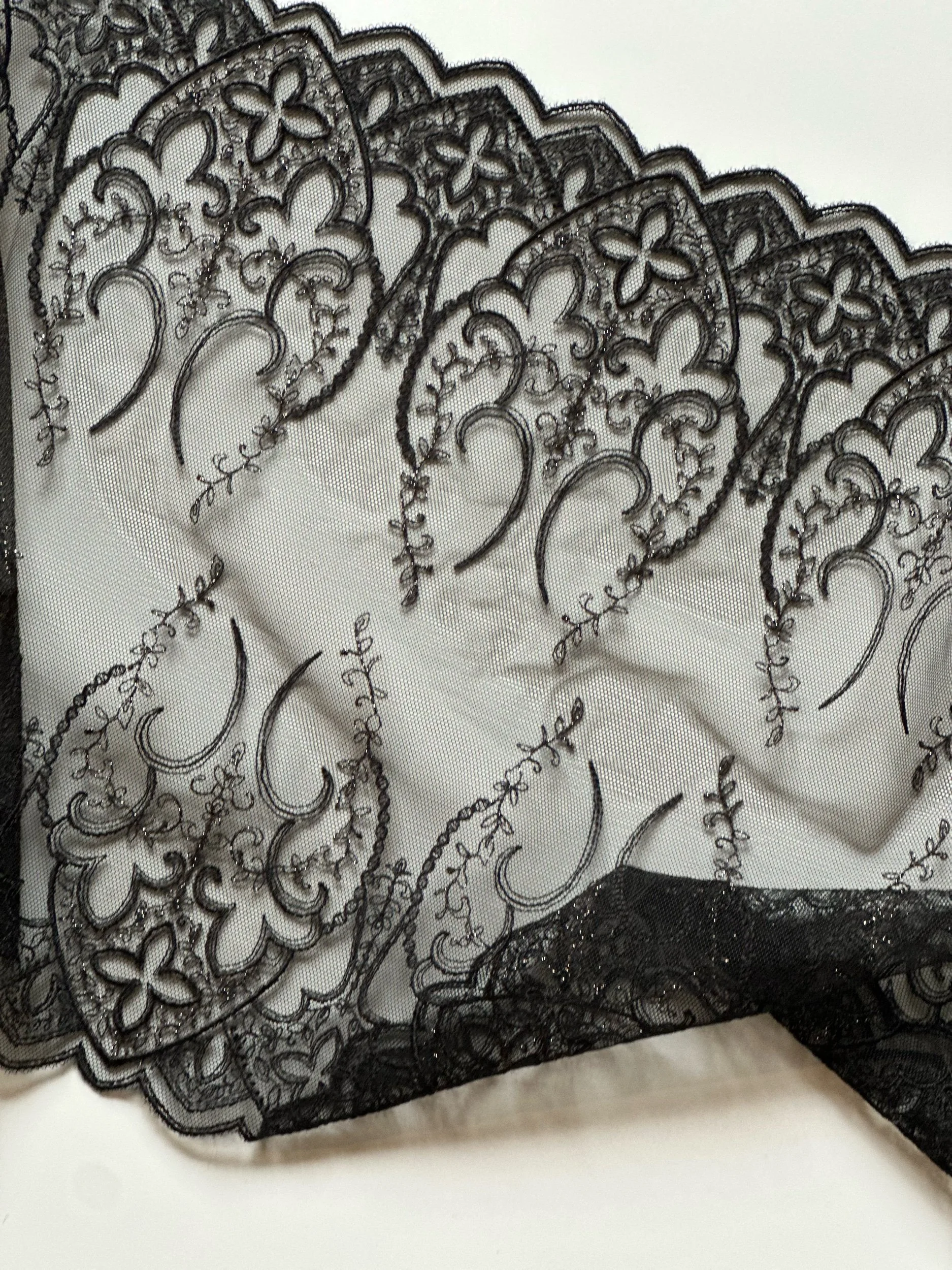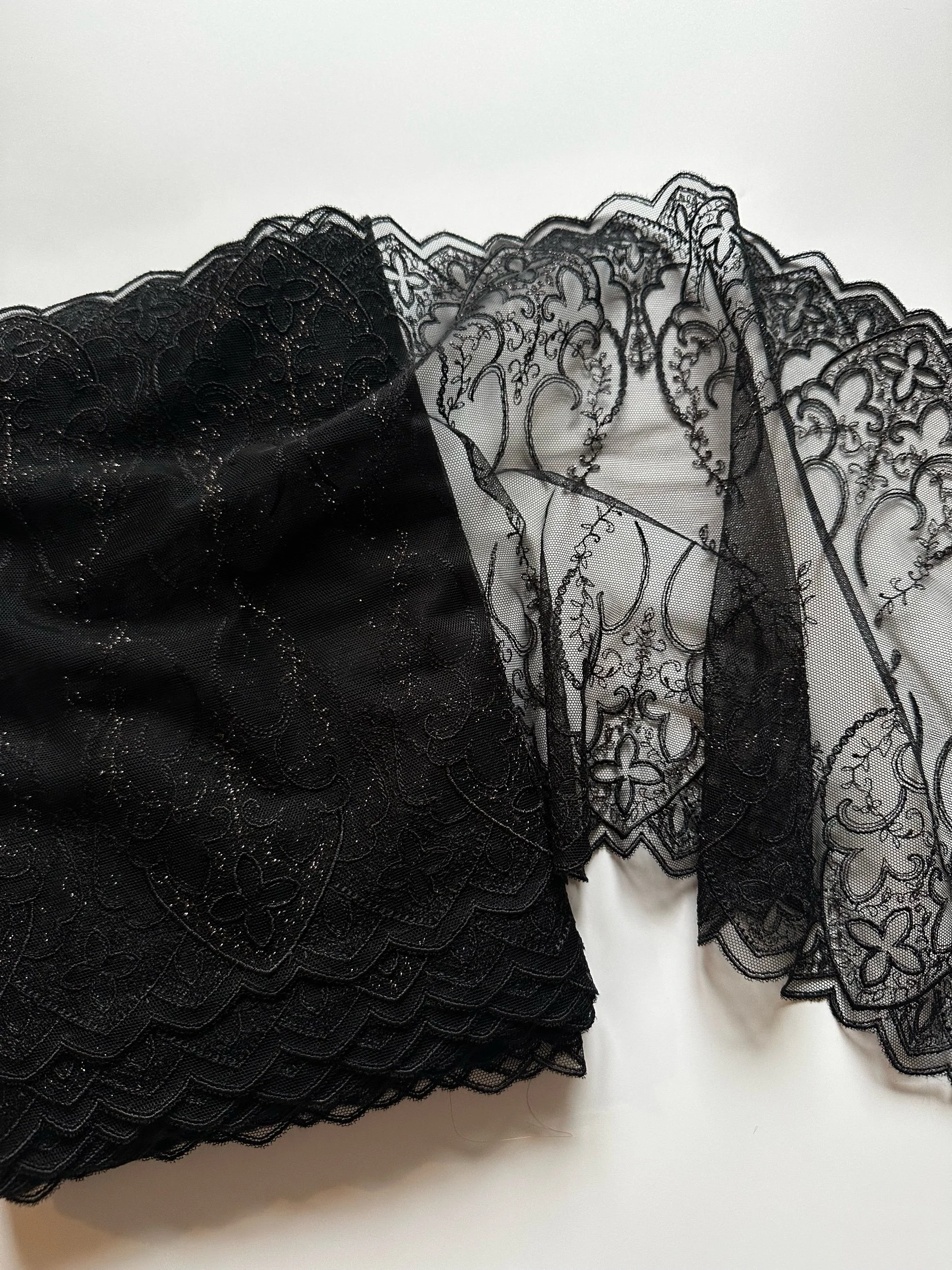 This lace has a soft hand feel touch with exquisite embroidery details. Along some of the stitches there is rose-gold Lurex thread. The embroidery design resembles gothic cathedrals. It’s stunning!