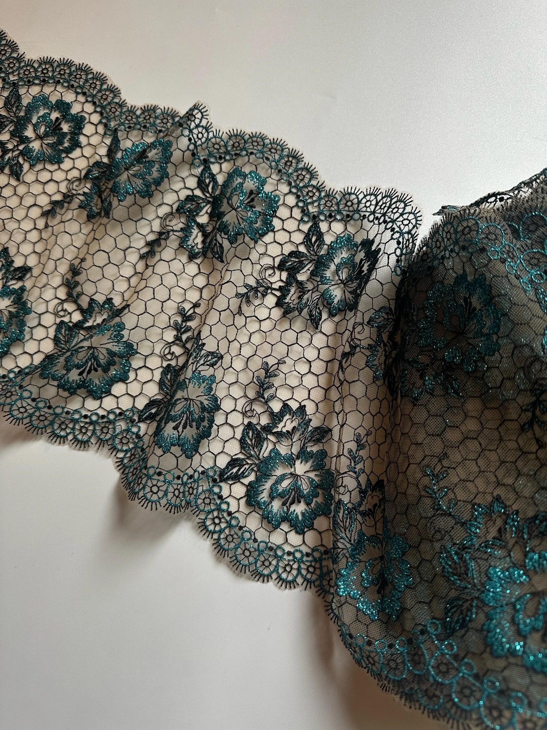This lace has a soft hand feel. Tulle is medium nude. Embroidery motifi measures about 4” wide before another repeating motif. Dazzling Lurex embroidery details throughout.