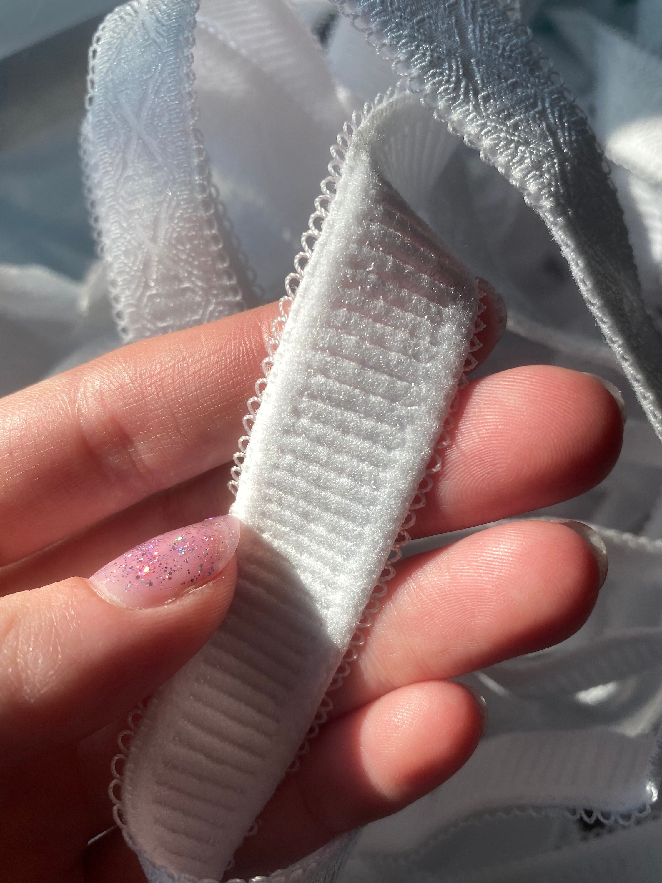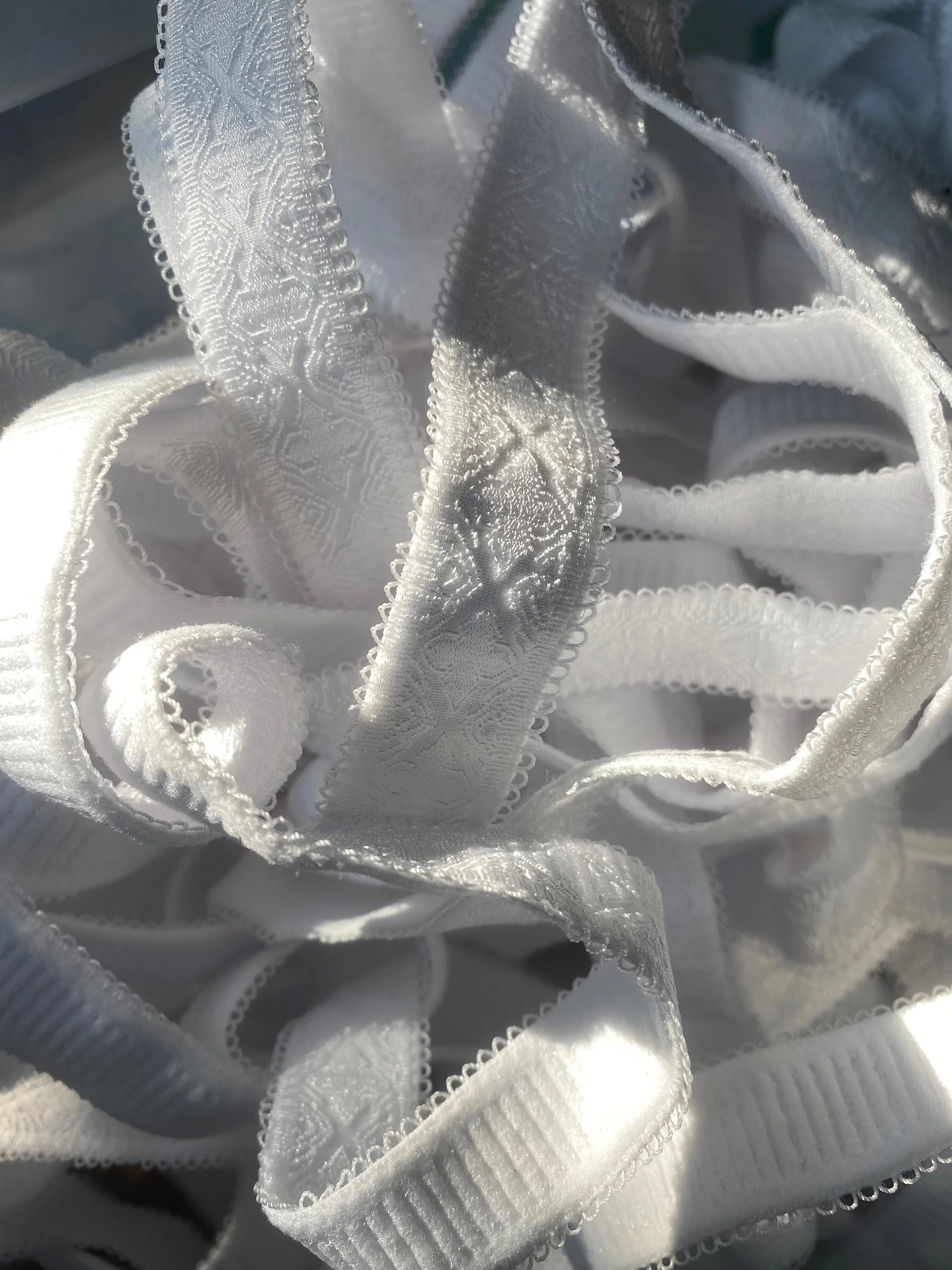 This bra strap elastic is very firm and has a very plush backside. There is little picot details on both sides with a cool geometric jacquard design through the middle.