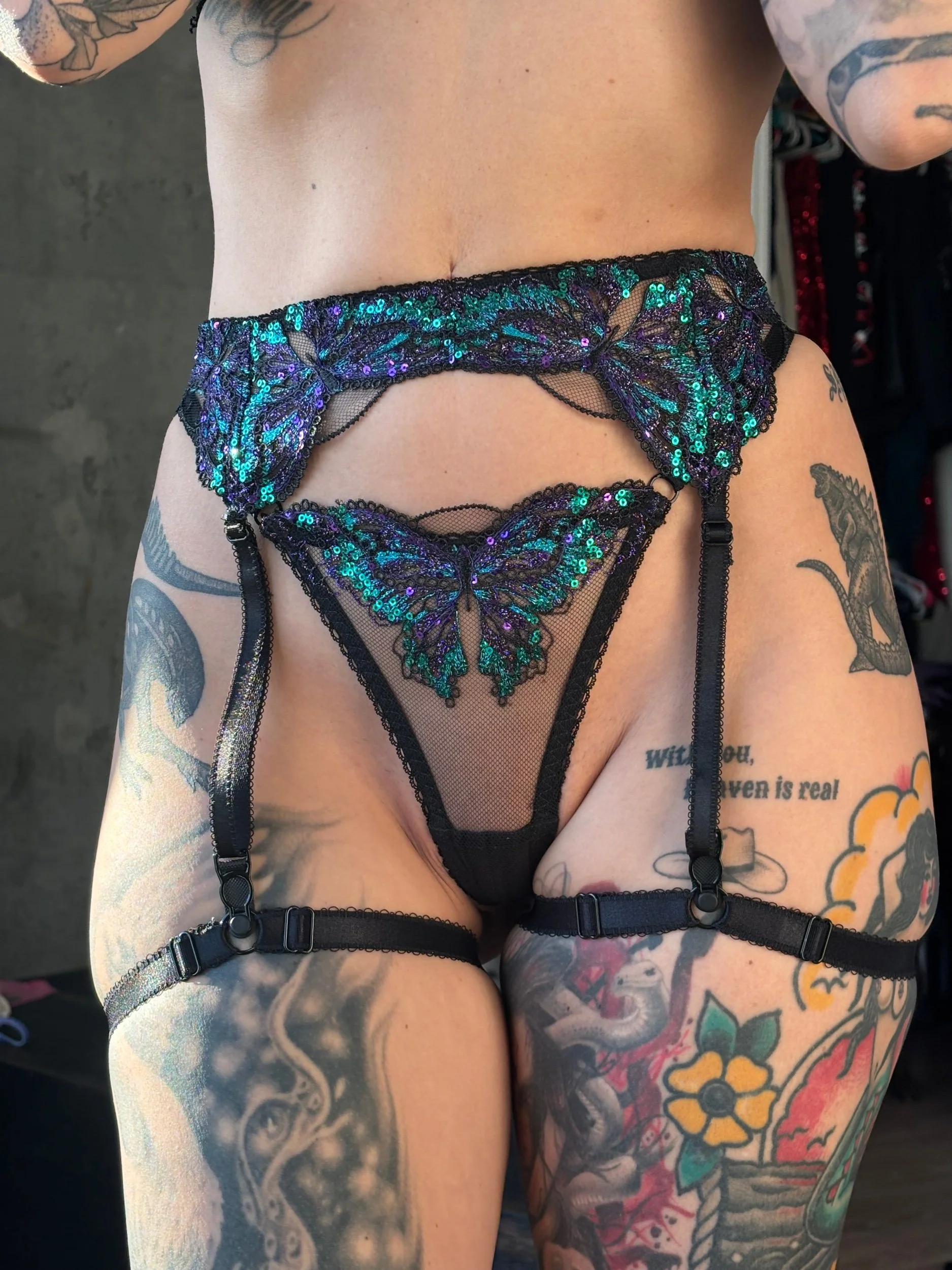 The sexiest 90’s butterfly panty to match the Sequined butterfly Bra and Garter belt. Sheer and barely there.
